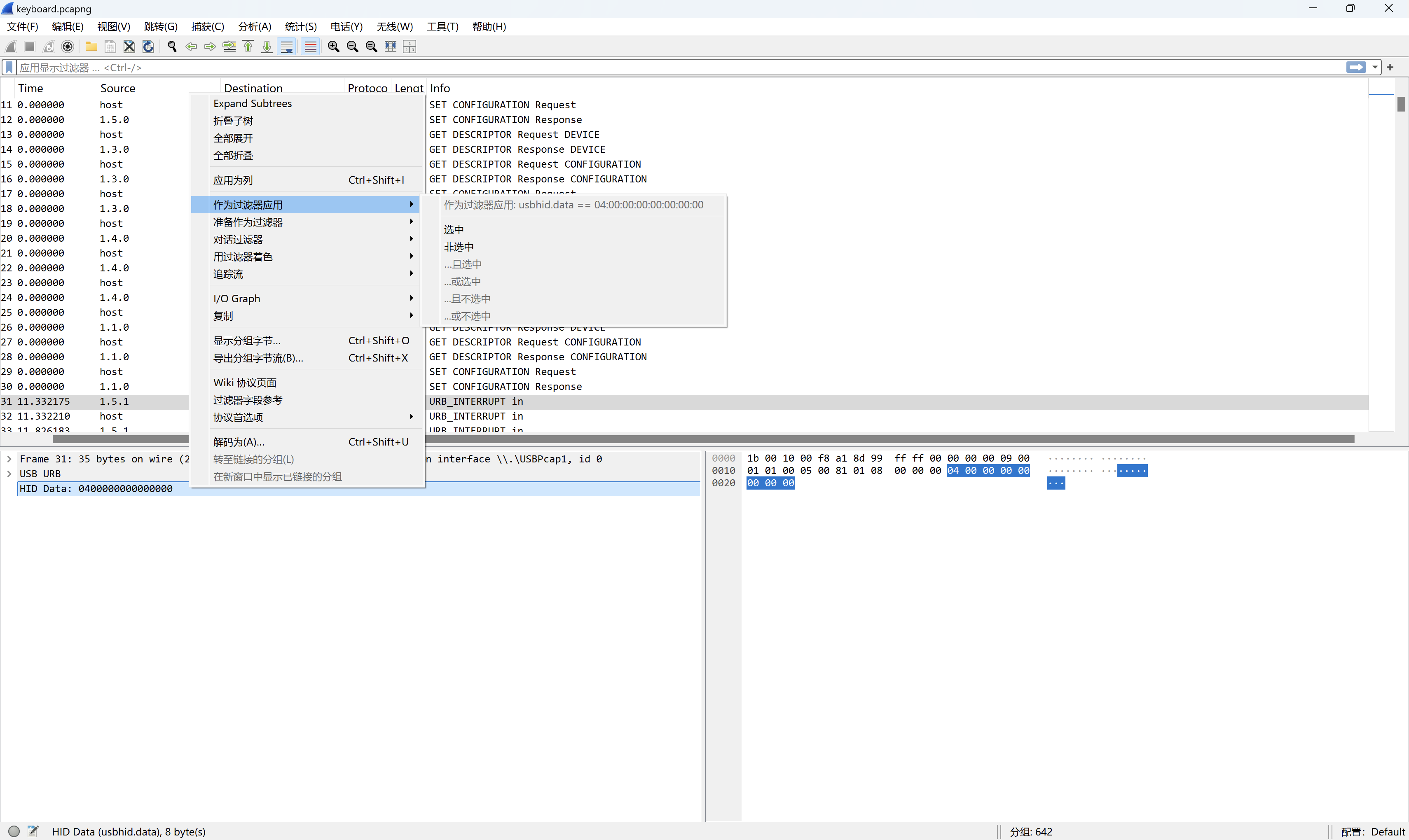 用WireShark打开文件,发现USB流量,以及“HID DESCRIPTOR”参数. 因此可以用tShark来提取数据.