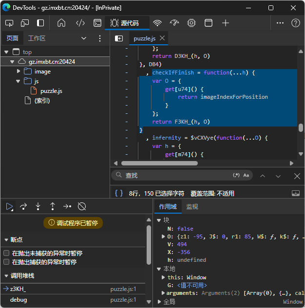 代码进行了混淆,但发现里面有一个函数checkIfFinish,尝试将其返回值改成1(使用抓包工具拦截修改),点击一下拼图即可获得flag.